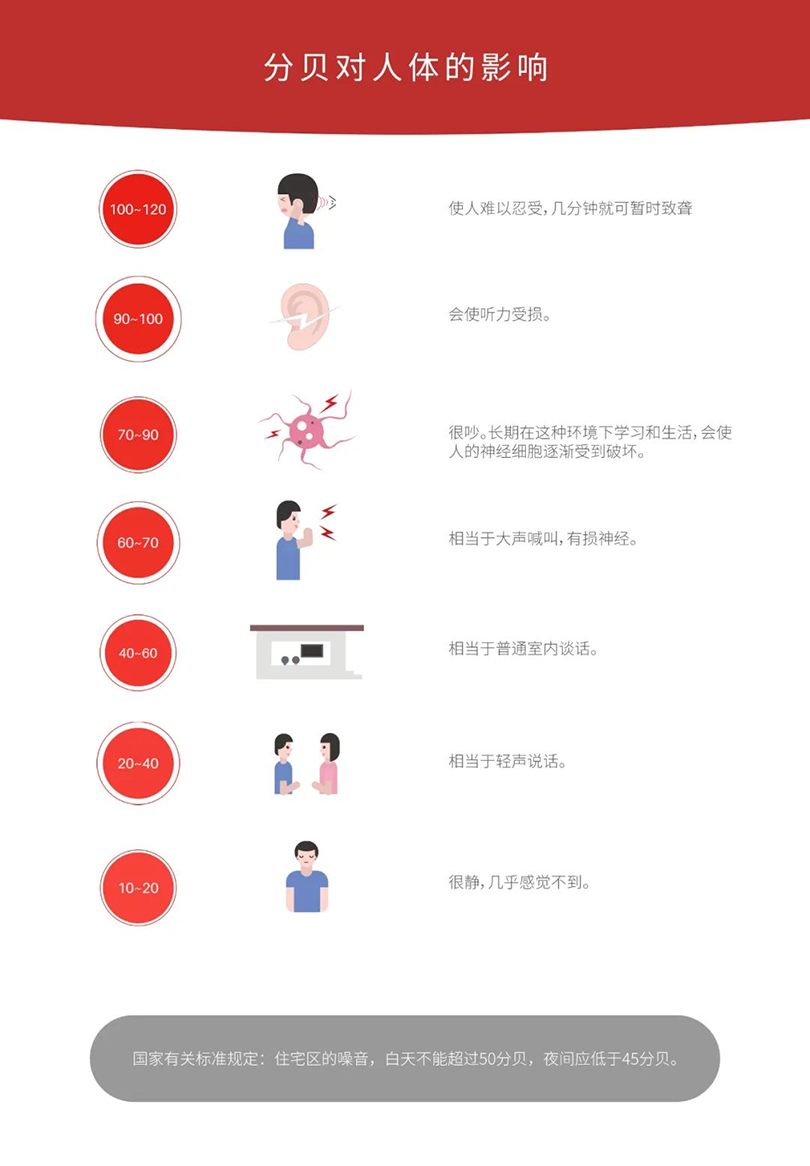 研究證實,噪音對人體健康有著非常嚴重的影響,如果噪音長期作用于中樞神經(jīng)系統(tǒng),會使大腦皮層興奮和抑制的平衡失調(diào),導致條件反射異常、腦血管張力受損害,使人頭疼、頭暈、耳鳴、失眠多夢、全身疲乏無力,還會引起消化不良、胃潰瘍及高血壓、冠心病、動脈硬化等疾病。值得關(guān)注的是,對于正處于生長發(fā)育期的嬰幼兒來說,噪音危害尤其明顯。據(jù)臨床醫(yī)學資料統(tǒng)計,若在80分貝以上噪音環(huán)境中生活,造成聾啞者可達50%!